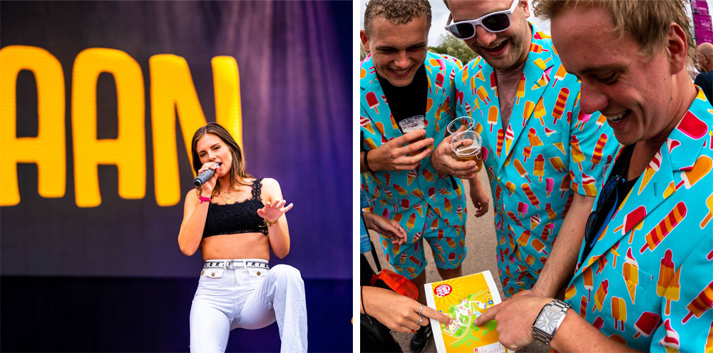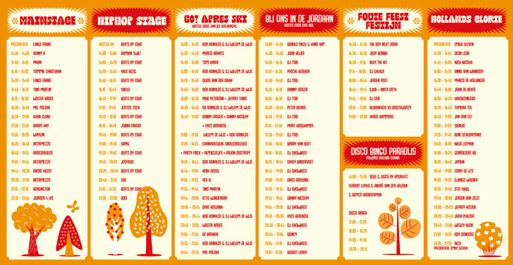 The event features only Dutch artist and is organised by UDC, the same organisation that does Dance Valley. We wanted to give the brand a more creative and naïve illustrated feel, as we felt it was a bit stiff before. The colour orange represents the Dutch, so choosing that made sense. We tried some designs in the colours of our national flag (red, white and blue) but in the end, we decided the orange felt warmer and therefore much cosier.